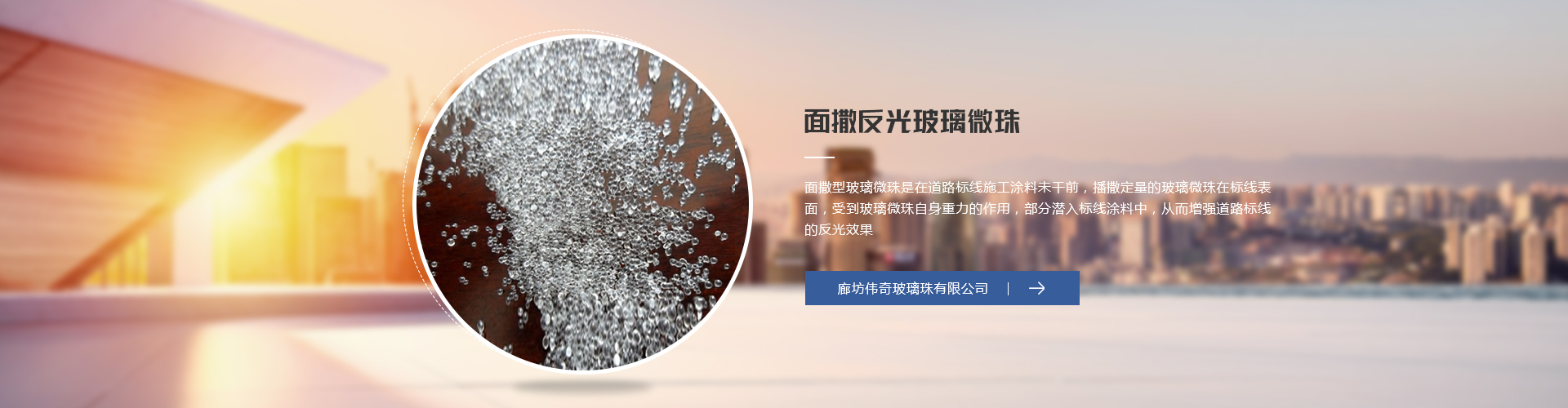 廊坊偉奇玻璃珠有限公司是生產(chǎn)經(jīng)營玻璃珠系列產(chǎn)品的專業(yè)企業(yè)。 公司成立于1996年,坐落于具有“玻璃珠基地”美譽的河北省廊坊市永清縣,有5條流水線,年生產(chǎn)玻璃珠30000噸、玻璃砂20000噸。公司地理位置便利,距北京大興國際機場30公里,天津新港110公里。公司嚴格按照ISO9001質(zhì)量管理體系和ISO14001環(huán)境管理體系進行管理和生產(chǎn)以確保產(chǎn)品質(zhì)量和在生產(chǎn)過程中實現(xiàn)對環(huán)境的保護。主要生產(chǎn)道路標(biāo)線反光玻璃微珠、鍍膜玻璃微珠、雨夜玻璃珠和工業(yè)機械噴丸、清理、拋光用玻璃微珠及工藝品裝飾用彩色玻璃微珠系列產(chǎn)品,還生產(chǎn)各種規(guī)格玻璃砂